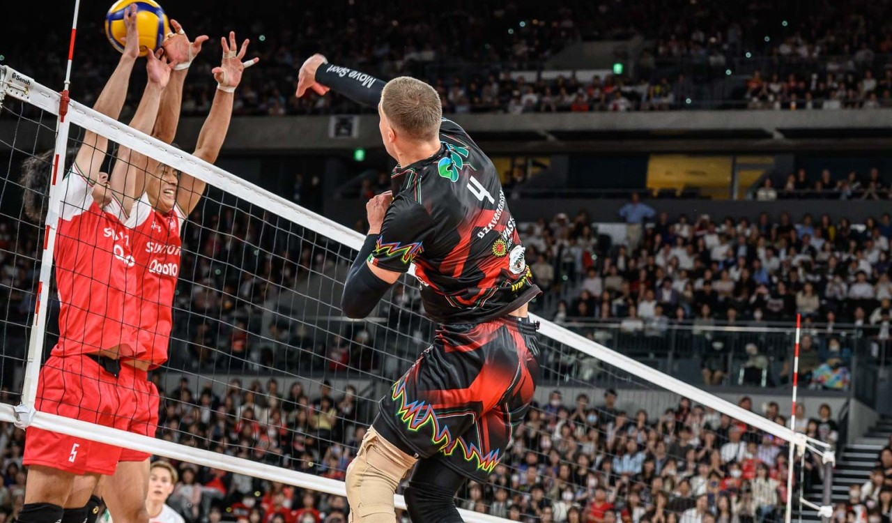 La squadra di casa spinge a muro e in attacco in avvio di match, Ishikawa gioca d’astuzia e Solè pareggia subito i conti. Il Suntory allunga con il muro di Kliuka sullo schiacciatore giapponese di casa bianconera e amministra il vantaggio con delle buone difese. Argilagos arma i suoi centrali, Loser va a segno in primo tempo e a muro e poi arriva il turno in battuta di Plotnytskyi: il suo ace a 122 km/h, seguito da un nuovo muro di Loser, fa tornare i suoi in partita.