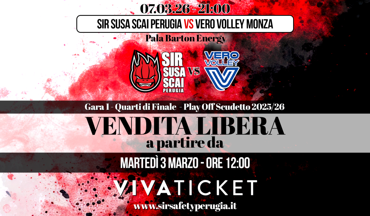 È attiva dalle 12 di oggi, martedì 03 marzo, la vendita libera dei biglietti per Gara 1 dei Play Off scudetto 2025/2026, in programma al PalaBarton Energy sabato 07 marzo alle 21. È possibile acquistare i tagliandi on line, nel circuito vivaticket, o nei punti vendita abilitati.